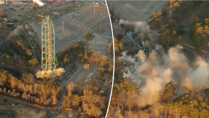 A record-breaking roller coaster was demolished at a Six Flags park in New Jersey on Friday, marking the end of a thrilling chapter in amusement park history.
