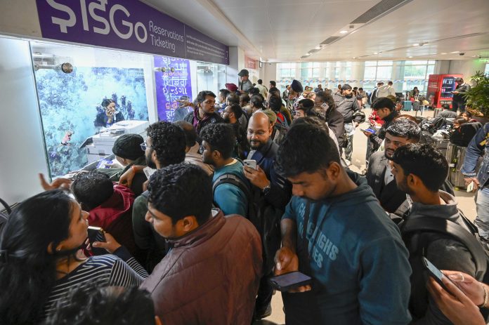 Passengers seen in heavy rush and chaos at the IndiGo counter at Indira Gandhi International Airport Terminal 1 after a technical glitch at IndiGo caused delays and cancellations of multiple flights on Dec. 4, 2025 in New Delhi, India.